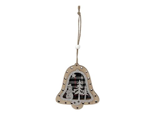 Závěs dřevo 100x95mm zvoneček se sněhulákem a stomečky, přírodní s glitrem, stříbrná