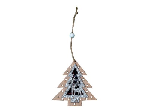 Závěs dřevo 2 ks 95x100mm stromek, přírodní s glitrem, stříbrná