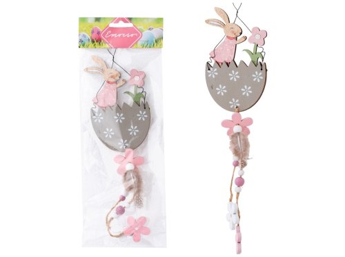 Závěs dřevo 85x135mm zajíc ve skořápce, přírodní, hnědá, růžová, bílá