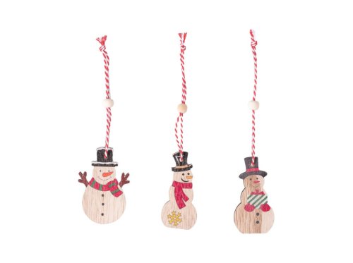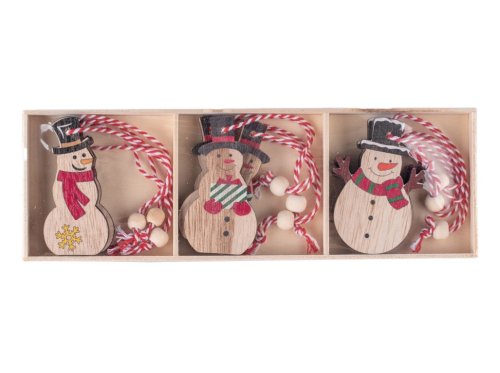 Závěs dřevo 9ks 50x70mm sněhuláci v krabičce,přírodní, barevná