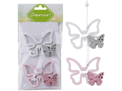 Dřevěný závěs s motivem motýlků a glitry v bílé a růžové barvě. Jeho rozměry jsou 75 x 60 mm.