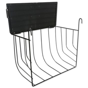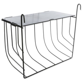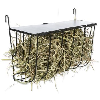 Závěsné kovové jesličky na seno s víkem v černé barvě.