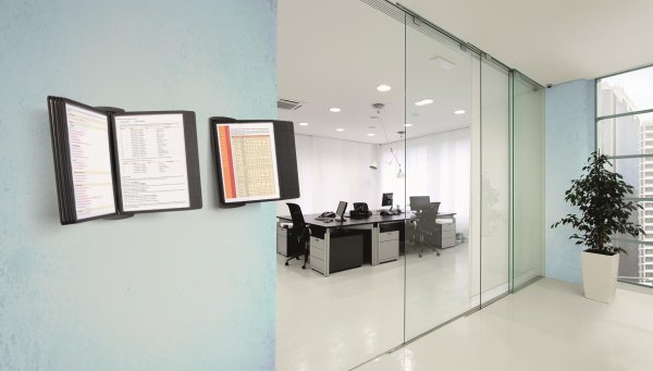 Kapsa otevřená do písmene "L" umožňuje lehkou manipulaci a jednoduchou výměnu dokumentů