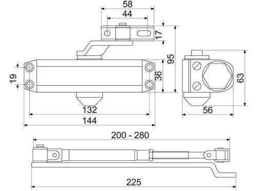 Dveřní zavírač s integrovanou aretací je vhodný pro interierové dveře do šířky 850 mm a váhy 45 kg dle EN 1154. Má nastavitelnou rychlost zavírání a doklapu. Ramínko je součástí balení. Aretace je přímo v těle zavírače a aktivuje se po otevření dveří o více než 90°.