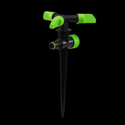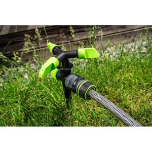 ABS tříramenný nastavení plochy postřikování pomocí ramene zavlažovače hrot pro zabodnutí do země možnost použití v řadě za sebou maximální průměr plochy postřikování 16 m
