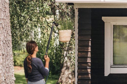 Zavlažovací tyč je vybavená třemi oblíbenými typy zavlažování, hlavu trysky lze natáčet v rozmezí 180 stupňů. Otáčením výměnné hlavy trysky s povrchem SoftGrip lze vybrat typy: tryska, mlha, sprcha. Regulace průtoku palcem je ergonomická a plynule nastavitelná. Pohodlně se drží, dokonce i za chladného počasí, ve srovnání s kovovými díly pro zavlažování. Univerzální připojení je kompatibilní s ostatními značkami. Výška: 87,8 cm, délka: 12,8 cm, šířka: 5,6 cm. Hmotnost: 0,44 kg.