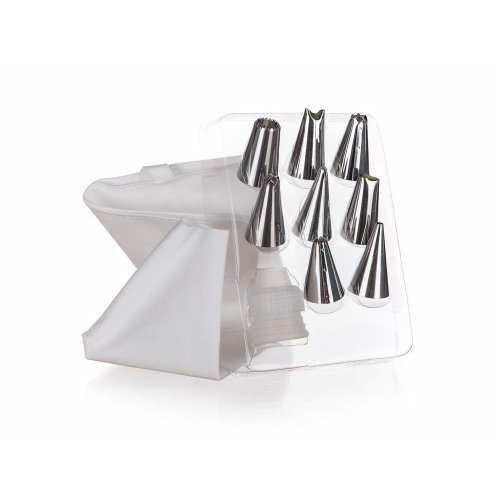 sada obsahuje: 1 x zdobící sáček 1 x konektor 8 různých druhů trysek, materiál nererz