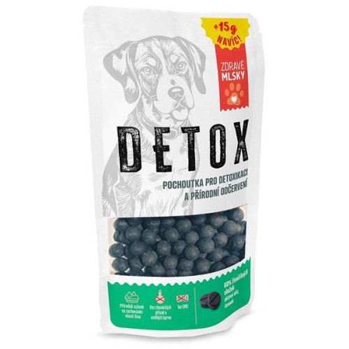 Zdravé mlsky Detox jsou ideální odměnou pro aktivní dospělé psy všech plemen. Díky přidanému černému uhlí a česneku zároveň napomáhají detoxikaci a přírodnímu odčervení. Pamlsky vyrobené v České republice jsou přírodně sušené se zachováním všech živin, bez obsahu GMO, chemických přísad a barviv. Složení: 60 % masa (20 % sušené hovězí maso, 20 % sušené maso sladkovodních ryb, 20 % sušené maso z lososa), sušená vejce, směs bezlepkových mouk, pšeničné klíčky bezlepkové, pivovarské kvasnice, rybí tuk, živočišný tuk, lososový olej, aktivní uhlí, česnek, glycerol, masový vývar bez glutamanu. Analytické složky: hrubý protein 35 %, hrubý tuk 12 %, hrubý popel 10 %, hrubá vláknina 1,5 %, škrob 14 %. Metabolizovatelná energie: 2 866 kcal/kg Dávkování: