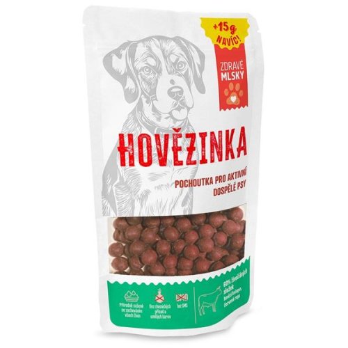 Zdravé mlsky Hovězinka jsou ideální odměnou pro aktivní dospělé psy všech plemen. Základ pamlsků tvoří sušené maso, přidaná červená řepa a mrkev poskytují vitamíny (A, C, kyselinu listovou), minerály (železo, draslík), vlákninu pro trávení a antioxidanty a lososový olej podporuje zdraví kůže a lesk srsti. Pamlsky vyrobené v České republice jsou přírodně sušené se zachováním všech živin, bez obsahu GMO, chemických přísad a barviv. Složení: 60 % masa (20 % sušené hovězí maso, 20 % sušené maso sladkovodních ryb, 20 % hovězí vločkový kolagen), sušená vejce, směs bezlepkových mouk, pšeničné klíčky bezlepkové, pivovarské kvasnice, rybí tuk, živočišný tuk, lososový olej, červená řepa, mrkev, červená sladká paprika, glycerol, masový vývar bez glutamanu. Analytické složky: hrubý protein 36 %, hrubý tuk 13 %, hrubý popel 10 %, hrubá vláknina 1,6 %, škrob 14 %. Metabolizovatelná energie: 3 343 kcal/kg Dávkování:
