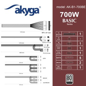 Akyga® AK-B1-700BE je napájecí zdroj ze série Basic s výkonem 700 W. Zařízení je jedním ze základních napájecích zdrojů ATX Akyga používaných k napájení stolních počítačů.
