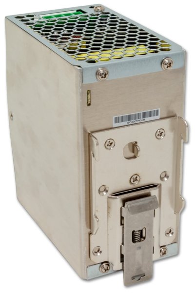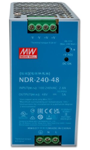 Napájecí zdroj pro instalaci na DIN lištu. Výstupní napětí 48 V DC, zatížitelnost 240 W. Provozní teplota -10 až 70 °C.