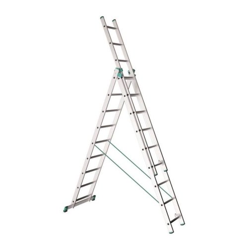 žebřík hliníkový trojdílný univerzální EUROSTYL ALVE počet příček 3x6 až 3x12 max. výsuvná délka 3,71 až 7,96 m šířka žebříku 454 mm byly použity odlehčené materiály s důrazem na lehkost a snadnou manipulaci …