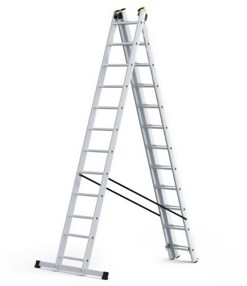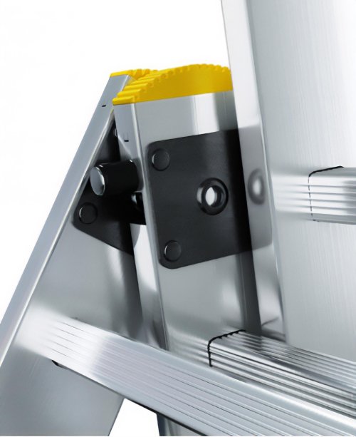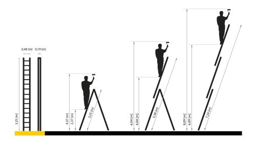Délka žebříku ve složeném stavu: 3,25 m Maximální délka při jedné základně: 7,24 m Maximální délka při dvou základnách (A): 5,38 m Max pracovní výška: 8,09 m Šířka: 1,2 m (základny) Šířka příček: 0,48 m Max.nosnost: 150 kg Materiál: hliník/plast Hmotnost: 23,0 kg Přepravní rozměr: 325x48x22 cm Norma: EN 131 TÜV Rheinland