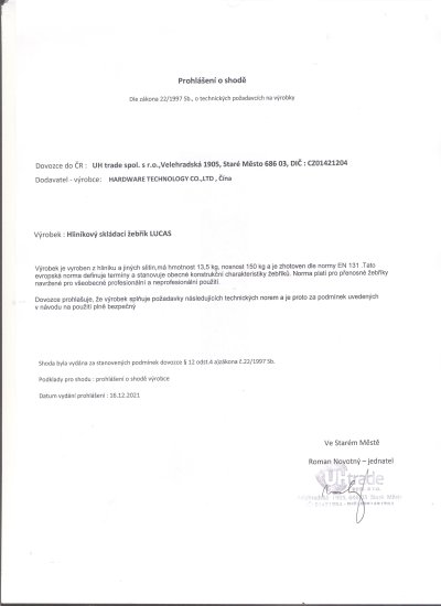 Seznam bezpečnostních varování týkajících se žebříků vychází z požadavků nařízení (EU) 2023/988 o obecné bezpečnosti výrobků (GPSR): 1. Riziko pádu: * Vždy se ujistěte, že je žebřík stabilní a umístěný na rovném povrchu. * Nepoužívejte žebřík na kluzkém povrchu, pokud nepoužijete dodatečné protiskluzové ochrany. * Nikdy nevstupujte na žebřík, pokud jste unavení nebo pod vlivem alkoholu nebo drog. * Při nastupování a sestupování se vždy držte žebříku oběma rukama. * Nenaklánějte se nadměrně mimo žebřík, protože hrozí ztráta rovnováhy. * Vyhněte se používání žebříku při silném větru nebo jiných nepříznivých povětrnostních podmínkách. 2. Riziko zranění: * Při používání žebříku vždy noste vhodnou ochrannou obuv a pracovní oděv. * Před každým použitím zkontrolujte poškození žebříku, jako jsou praskliny, ohyby nebo opotřebované prvky. * Nepoužívejte poškozený žebřík – hrozí vážné zranění. * Dávejte pozor na elektrické kabely při práci s žebříkem. 3. Riziko přetížení: * Nepřekračujte maximální zatížení žebříku. * Vyhněte se pokládání těžkých předmětů na žebřík, které mohou způsobit jejich přetížení. 4. Riziko nesprávného použití: * Vždy používejte žebřík v souladu s jeho určením a pokyny výrobce. * Nepoužívejte žebřík jako lešení nebo pracovní plošinu, pokud k tomu není určen. * Neupravujte žebřík žádným způsobem. 5. Riziko nesprávného skladování: * Uchovávejte žebřík na suchém a bezpečném místě, mimo dosah dětí a zvířat. * Chraňte žebřík před mechanickým poškozením a korozí. 6. Další upozornění: * Pokud máte jakékoli pochybnosti o bezpečném používání žebříku, poraďte se s odborníkem nebo vyškoleným pracovníkem. * Nezapomeňte, že bezpečnost je nejdůležitější – při práci ve výškách neriskujte pád nebo zranění. * Pravidelně provádějte údržbu a čištění žebříku, abyste zajistili jeho funkčnost a bezpečnost při používání.