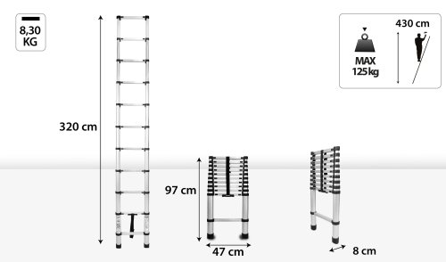 Výška ve složeném stavu: 0,97 m Výška v rozloženém stavu: 3,2 m Pracovní výška: 4,30 m Šířka: 0,47 m Nosnost: 125 kg Materiál: hliník Hmotnost: 8,3 kg Přepravní rozměr: 0,97x0,47x0,08 m