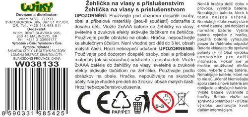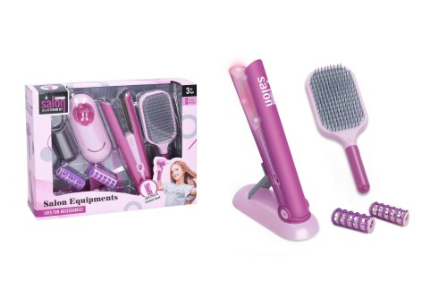 Žehlička na vlasy. Velikost žehličky 19cm. Obsahuje: kulmu, kartáč na vlasy, natáčky, stojánek na kulmu. Zvukové a světlené efekty. 2xAAA baterie nejsou součástí.