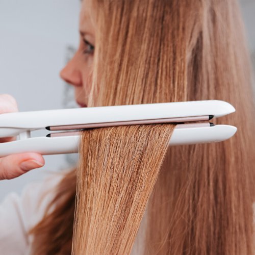 Žehlička na vlasy VZ2110 Glam Style nabízí profesionální styling v pohodlí domova. Je vybavena plovoucími keramickými deskami, které se přizpůsobí každému prameni a zajišťují dokonale hladký skluz bez poškození vlasů. Díky rychlému nahřátí a čtyřem teplotním stupňům (160–220 °C) je vhodná pro všechny typy vlasů. Samozřejmostí je automatické vypnutí a zámek žehlících ploch pro bezpečné a praktické použití.
