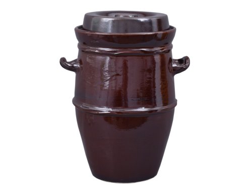 Keramický glazovaný hnědý lesklý 23l zelák s víkem. Zelák má téměř tvar válce, který se u hrdla rozevírá, aby se dal pohodlně zavřít víkem. Pod hrdlem jsou kvůli lepší manipulaci přidělaná keramická ucha. Zelák se používá ke kvašení a skladování zelí a pro jinou podobně zpracovanou zeleninu. Rozměry: d. 47 x v. 51cm.