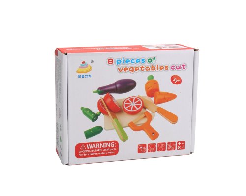 Krájecí dřevěné potraviny. Rozkroj mrkev nebo rajče. Hra pomáhá rozvoji dětské motoriky.