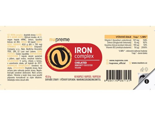 Doplněk stravy Železo chelát obsahuje snadno vstřebatelné železo ve formě chelátu v komplexu s vitaminy C, B12 a kyselinou listovou.