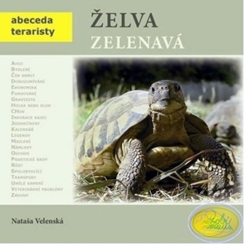 Autorka, paní Nataša Velenská, naše přední odbornice na chov želv, již řadu let působí v pražské ZOO. V knize obsáhle popisuje vše, co se týká chovu a odchovu Testudo hermanni - želvy zelenavé. Pro začínající teraristy je kniha absolutním základem, ale mnoho zajímavých a poučných poznatků zde naleznou i zkušení chovatelé. Nová kniha edice Abeceda teraristy přibližuje nejčastěji chovanou suchozemskou Želvu zelenavou (Testudo hermanni). Autorka Nataša Velenská v knize popisuje základní a potřebné informace pro chov těchto želv, od krmení, bydlení, růstu, až po rozmnožování či veterinární problémy. Kapitoly jsou řazeny podle abecedních hesel, doplněné množstvím fotografií a popisů. V každém výtisku je vložen arch, podle kterého můžete svou želvu jednoduše a přesně měřit a tím sledovat její růst. Údaje si můžete zaznamenat do příslušných kolonek na druhé straně archu.