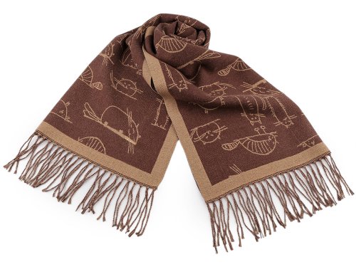 Zimní šála / pléd s třásněmi, kočky 65x180 cm - béžová tm.