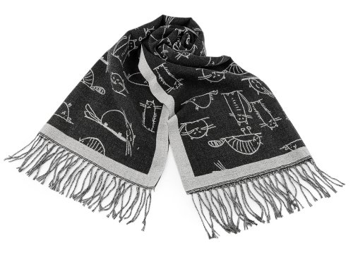 Zimní šála / pléd s třásněmi, kočky 65x180 cm - černá šedá světlá