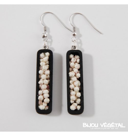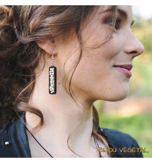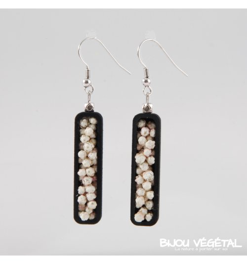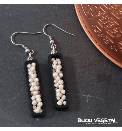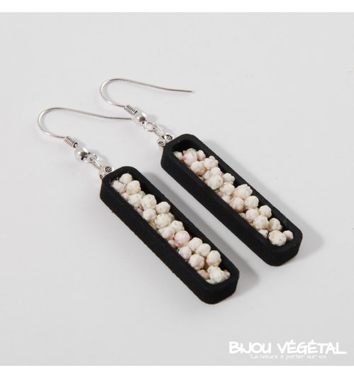 Živé šperky - Náušnice Jardiniere černé s trvalými bílými květy Nádherný módní doplněk ve výrazné barvě v kombinaci s trvalými bílými květy vytváří neobyčejný elegantní živý šperk. Živé šperky jsou stabilizovány patentovanou technologií a nepotřebují prakticky žádnou údržbu. Živé šperky sou baleny v krabičce, součástí balení je náhradní trvalá rostlina. Živé šperky jsou vyrobeny ručně ve Francii. Výrobce garantuje neomezenou životnost, při vhodném používání. Živé šperky nesmí být vystaveny velkým teplotním změnám a přímému proudu vody (při koupání, mytí nádobí apod.) Živé šperky byly poprvé představeny na mezinárodním veletrhu klenotů Bijorhca v Paříži roku 2015. Vytvořily je designové návrhářky a dlouholeté kamarádky Maryse a Manuella pro společnost Radis et Capucine. Živé šperky umožňují stálé propojení s přírodou a přinášejí ji doslova na dosah ruky. Francouzská značka Radis et Capucine