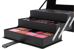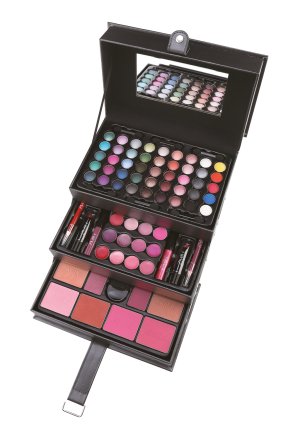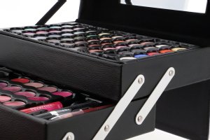 Kosmetický kufřík kožený Beauty Case Black – kožený černý – celkem 82 ks příslušenství. Obsahuje 45× očními stíny, 12× krémový lesk na rty, 8× tvářenka, 2× lesk na rty, 2× rtěnka, 2× tužka na rty, 1× sada 10 ks štětců a aplikátorů, 1× integrované zrcátko.Dermatologicky testováno, vyhovuje přísným normám EU.