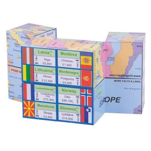 Didaktická kostka se skládá ve všech směrech a v mnoha kombinacích. Popisky na kostce jsou v angličtině. V každé kombinaci složení najdou děti užitečné informace o jednotlivých státech Evropy. Dozví se zajímavosti o tom, která země je nejlidnatější a která nejvíc vydělávající. Naučí se poznávat hlavní města a vlajky zábavnou formou. Mapa je rozprostřena po ploše kostky a lze ji interaktivně skládat. Skvělé pro použití ve školách, doma i na cestách. Splňuje aktuální bezpečnostní normy. Hlavní vlastnosti: fakta a čísla o hlavních městěch, populacích, jazycích a dalšímučení zeměpisu zábavnou a zajímavou formou