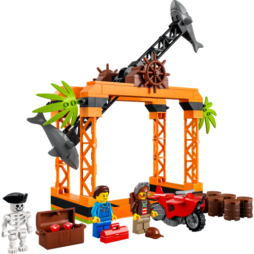 Povzneste hraní na novou úroveň s akční stavebnicí LEGO® City Žraločí kaskadérská výzva (60342). Úkolem dětí je aktivovat motorku se setrvačníkem a vyhnout se kostlivci a točícímu se kolu se žraloky, převrhnout barely a získat truhlu s pirátským pokladem. O hodiny nápaditého hraní se postarají 2 minifigurky, včetně postavy Chucka D. Goldberga ze seriálu LEGO City.