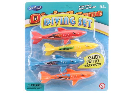 Hračka na potápění - žraloci. Sada obsahuje 4 ks žraloků různých barev. Materiál plast. Baleno na kartě. Rozměry balení 20x19x3,5 cm. Věk 3+