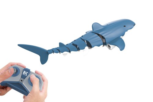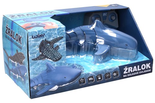 Žralok bílý RC do vody. Velikost 35 cm. Frekvence 2,4 GHz. 1 rotor na každé straně pod předními ploutvemi (celkem 2 rotory). USB nabíječka v balení. Pohyb dopředu a zatáčení do stran