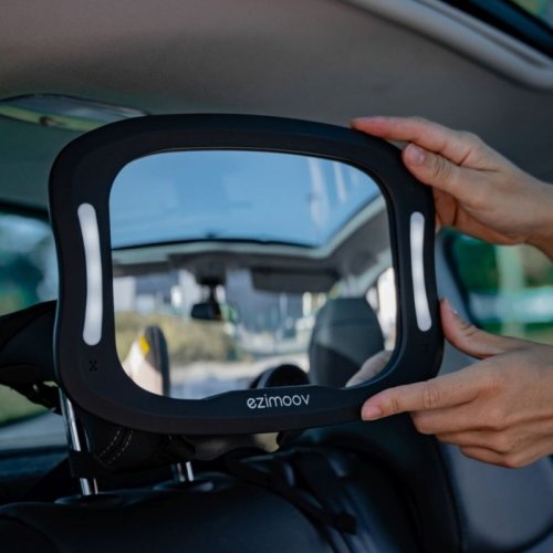 Extra velké zrcátko s LED osvětlením, které se upevňuje na opěrku hlavy zadního autosedadla.