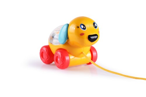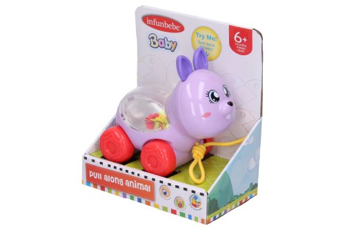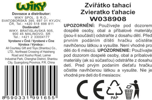 Zvířátko tahací. Velikost 12cm. Zvířátko je na kolečkách. Tažením za provázek jede vpřed a rozpohybuje kuličky na zádech zvířátka. 3 varianty - králík, slon, pes.