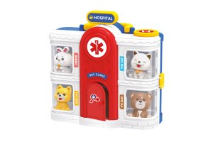 Zvířecí nemocnice přenosná s efekty. Rozměry kufříku 28x14x28 cm. Světelné efekty - stetoskop, bezkontaktní teploměr, oba vnitřní balkóny (přepínače ON/OFF). Obsah - rozkládací nemocnice s manuálním výtahem, 4 zvířátka - pejsek, kočička, medvídek, králíček, nástroje - stetoskop, teploměr, injekce, nůžky, kleště, pilulky. Používejte dle obrázků na obalu. 2xAG10 baterie do osvětlení každého balkónu, 2xAG10 do stetoskopu, 2xAG10 do teploměru součástí.