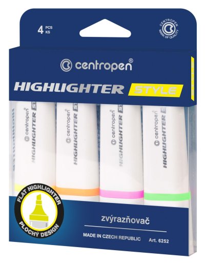 Plochý zvýrazňovač STYLE v atraktivním provedení Pro zvýraznění textu na všech druzích papíru vč. faxového Fluorescenční pigmentový inkoust Zkosený hrot Šíře stopy: 1,0 - 4,6 mm