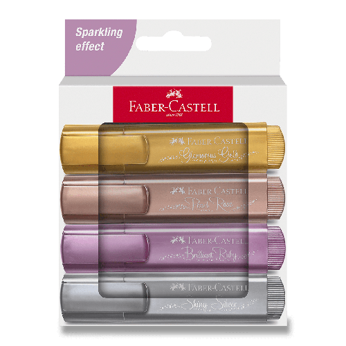 Plochý zvýrazňovač Faber-Castell Textliner 46 Metallic ve čtyřech netradičních odstínech s metalickým efektem.