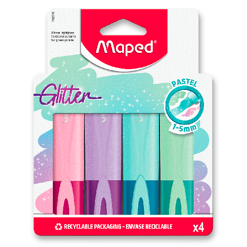 Plochý zvýrazňovač ve čtyřech pastelových barvách se třpytivými efekty.