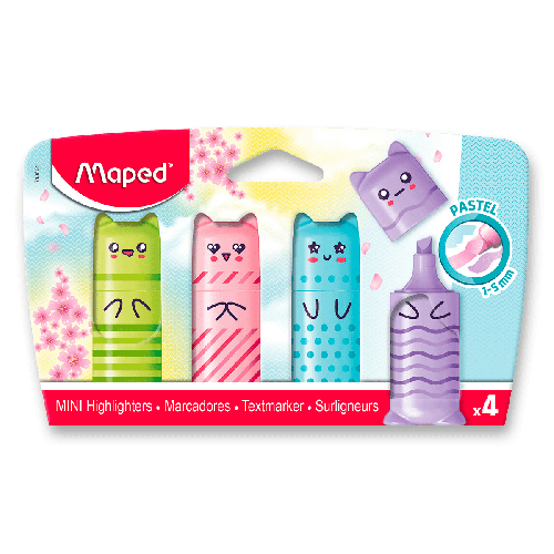 Set plochých mini zvýrazňovačů FluoPeps Mini v pastelových barvách a atraktivní designu. šíře stopy 1 nebo 5 mm fluorescenční inkoust seříznutý hrot ideální velikost do školního penálu