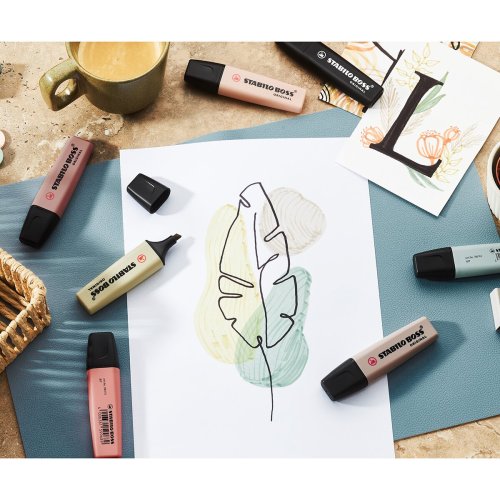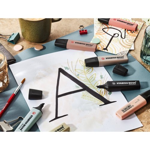 Zvýrazňovač STABILO BOSS ORIGINAL Nature Colors má plastové tělo v barvě inkoustu v zemitých barvách.